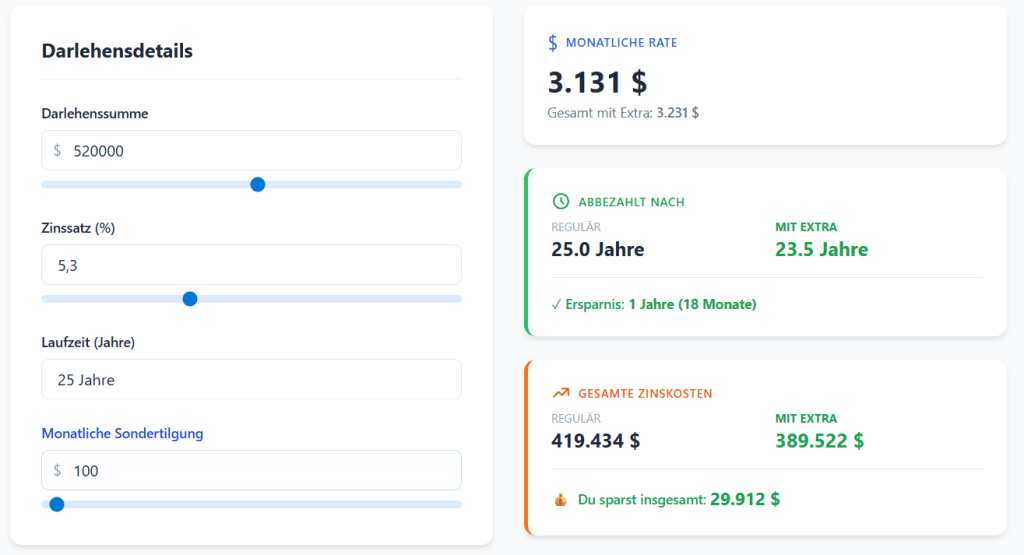 Um die Auswirkungen zusätzlicher Zahlungen zu verdeutlichen, kann ein einfacher Hypothekenrechner helfen. Mein neuer Freund Gemini hat einen einfachen Hypothekenrechner¹ entwickelt.